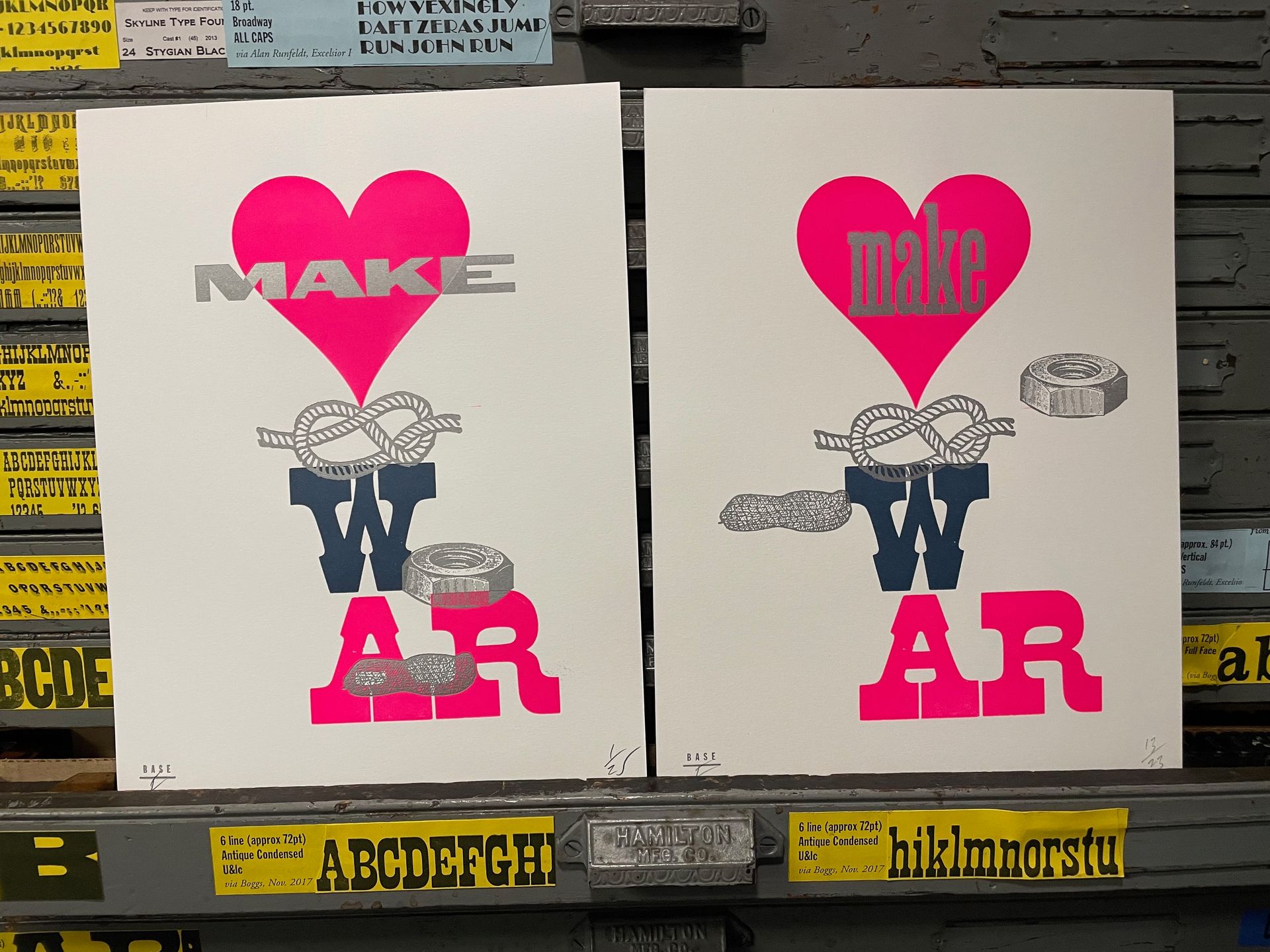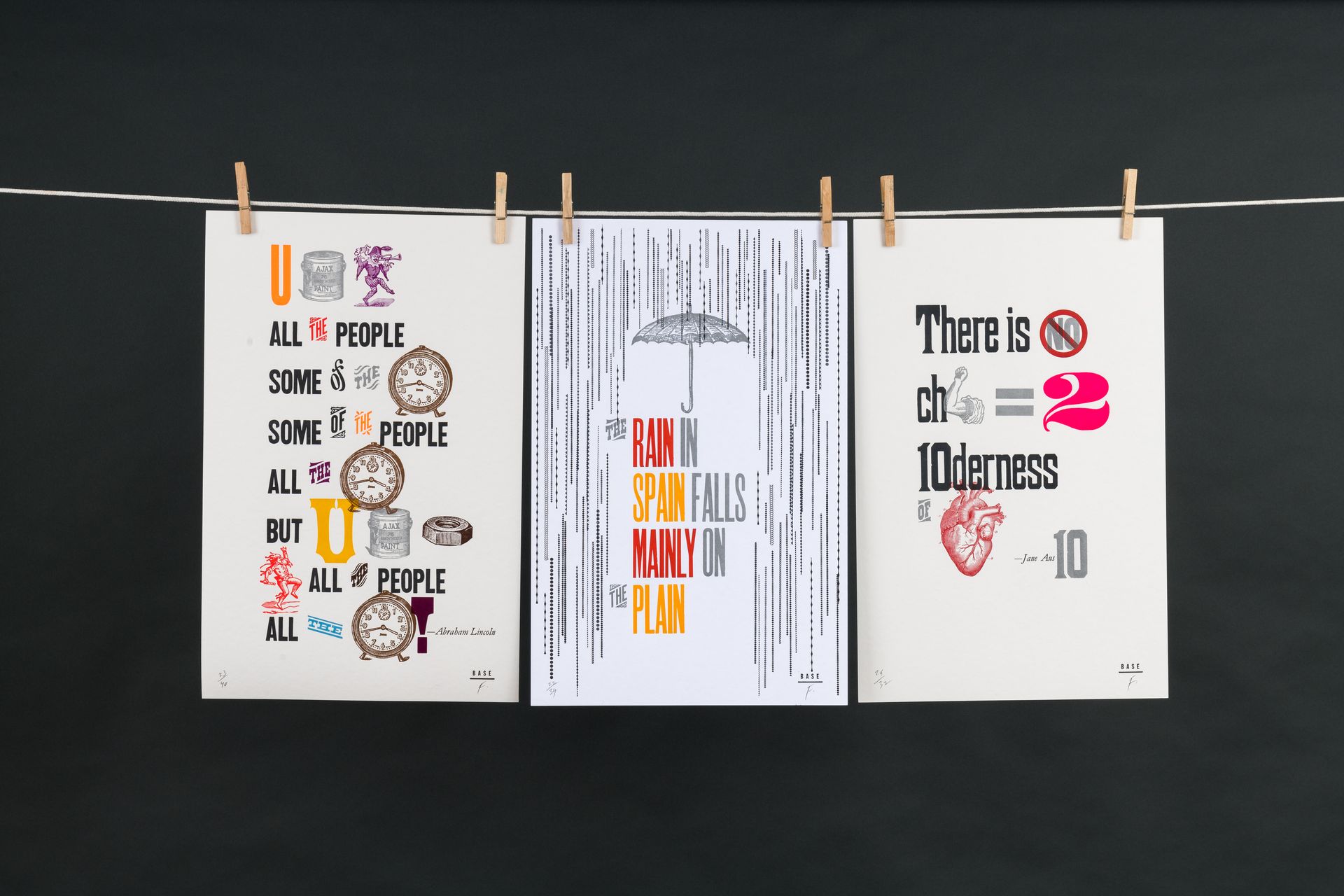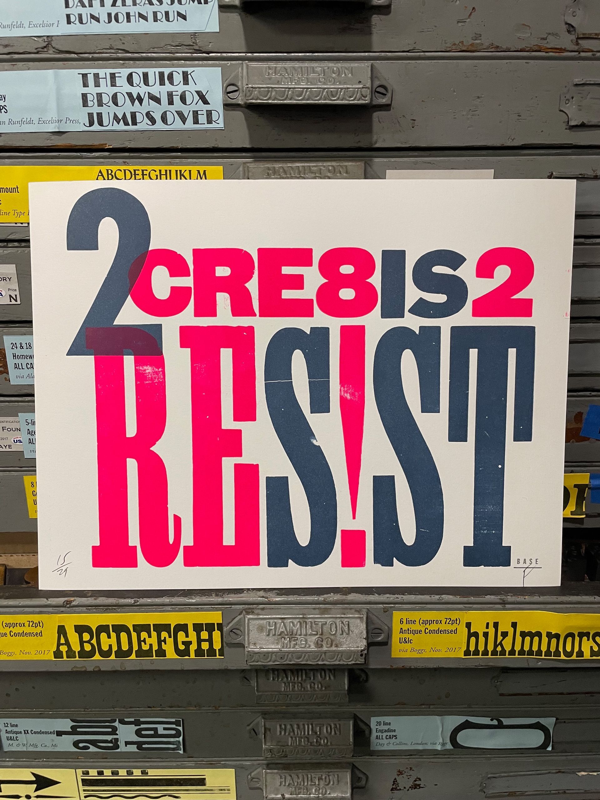 Base Press is the letterpress studio of Frank Baseman — graphic designer, printer, design educator, and A.P.A. member — operating since 2016 from Elkins Park, Pennsylvania, just outside Philadelphia. Baseman's work sits at the intersection of graphic design and fine-press letterpress printing, and it shows in the conceptual rigor of his output. His Rebus Quotes series earned a Judge's Choice Award at the 2019 AIGA Philadelphia Design Awards, and his prints are held in permanent collections at the Herb Lubalin Study Center of Design and Typography at the Cooper Union, Poster House in New York, the Cary Graphic Arts Collection at Rochester Institute of Technology, and the Tipoteca Italiana Fondazione in Cornuda, Italy.