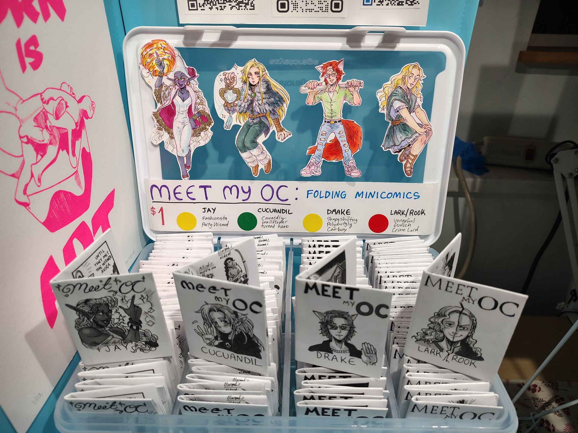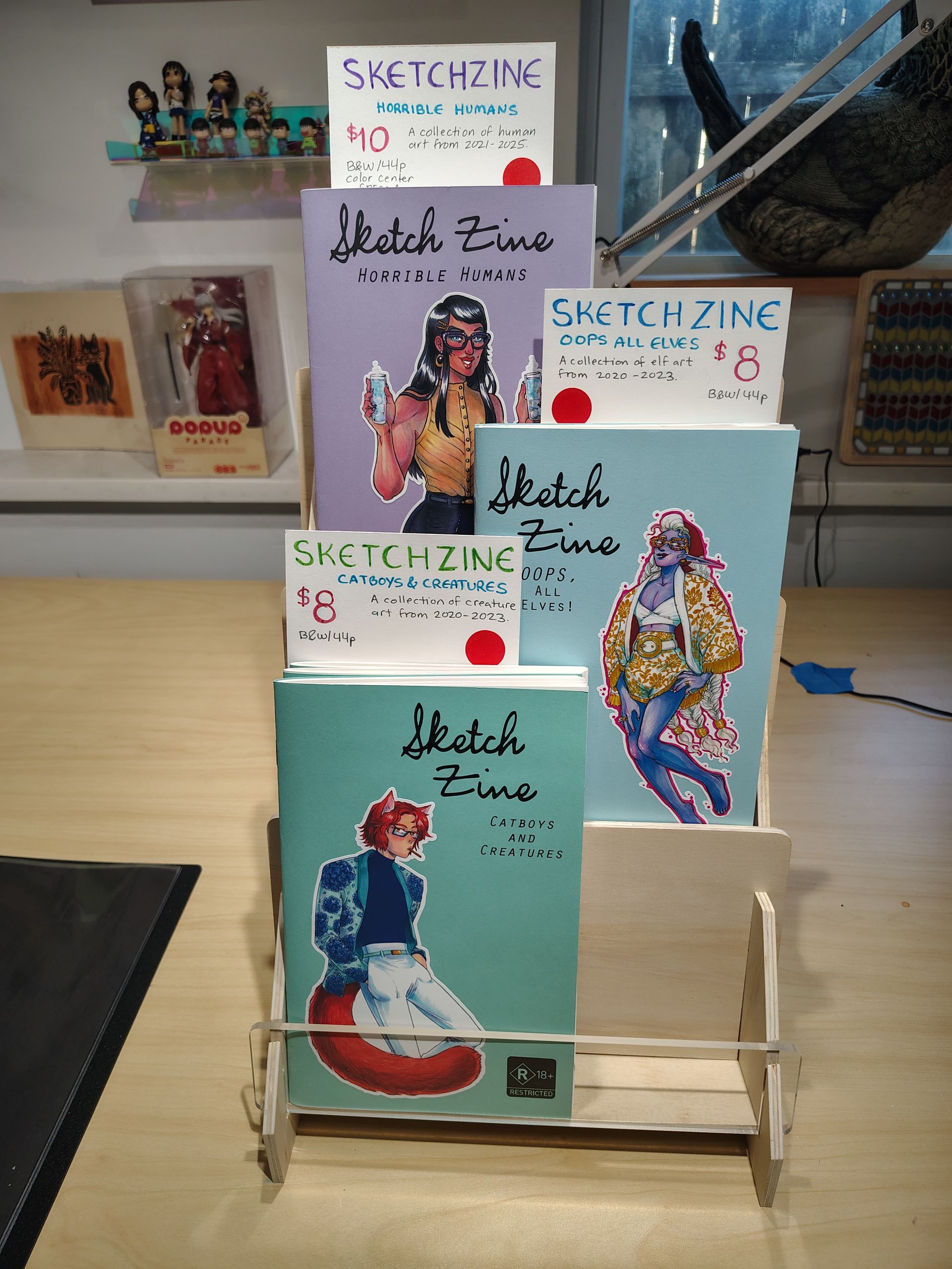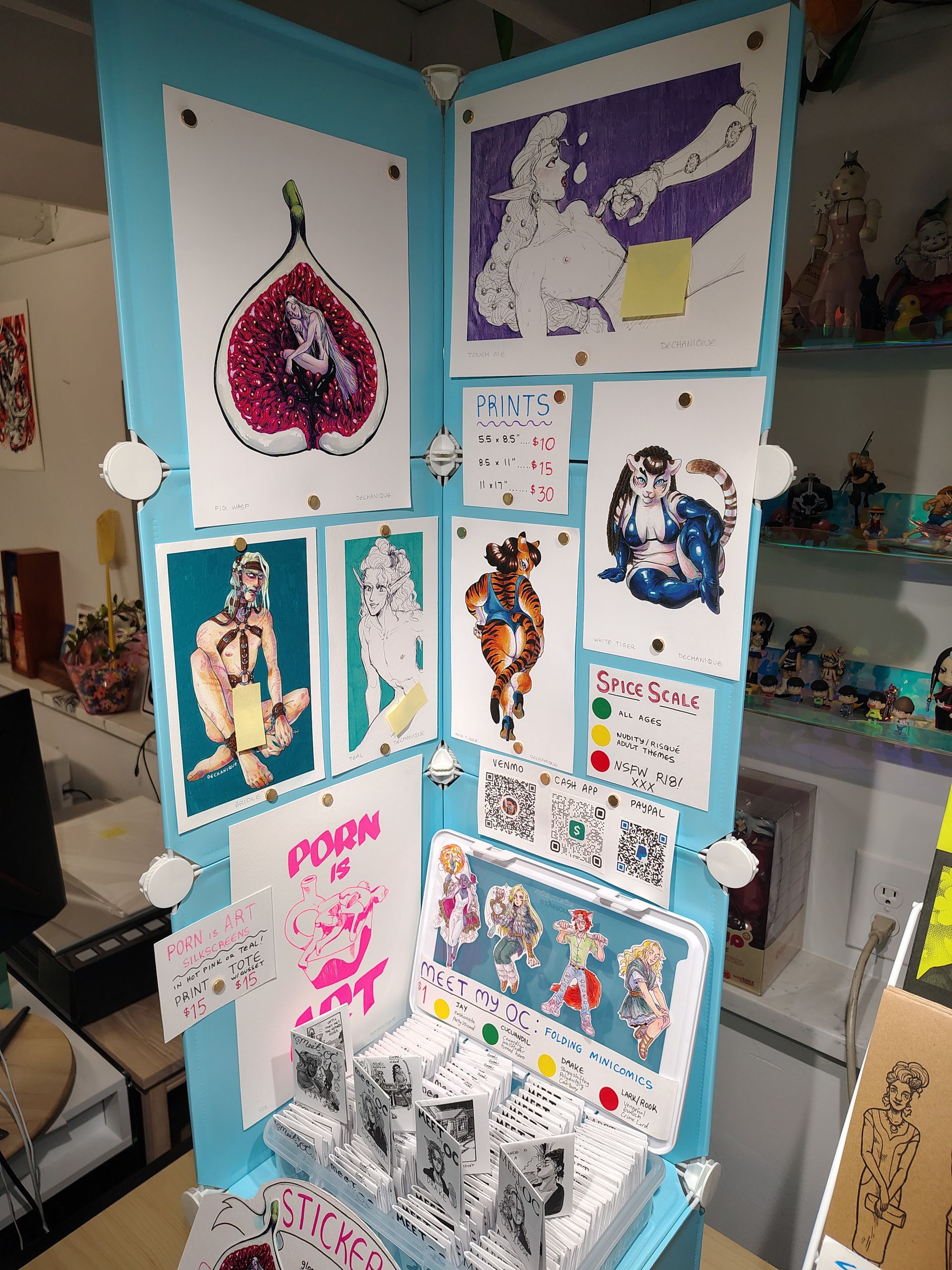 Dechanique is a Hyattsville, Maryland–based artist working in adult comics, illustration, and self-published zines — the kind of intimate, hand-produced work that lives in the same tradition as the letterpress and bookbinding at the heart of this fair. Operating from just outside Washington, D.C., in the dense creative community that clusters around Hyattsville's arts district, her practice centers on drawn narrative: comics that tell stories with specificity and visual economy, and zines that make that work accessible and shareable in small-run printed form. Dechanique's comics are rooted in sensuality, magic/fantasy, genderplay, and alt-history, inspired by their early loves of Sailor Moon, Ranma ½, and Bondage Fairies.